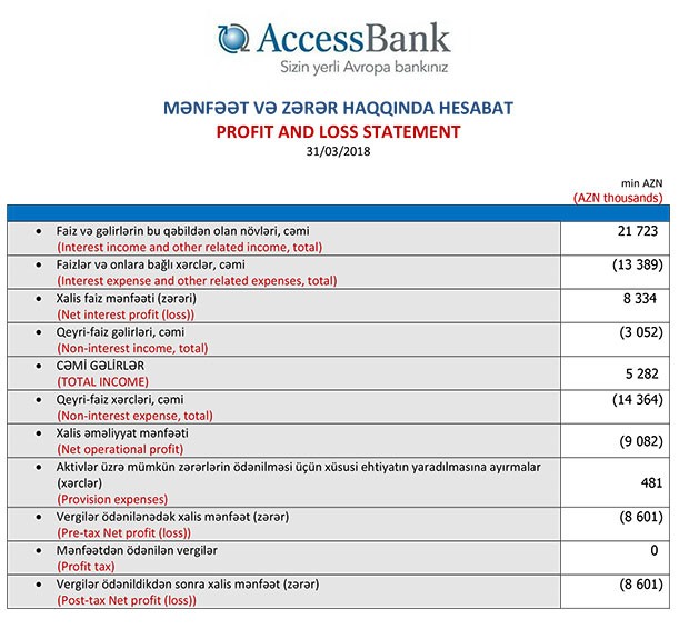 21 milyon 723 min manat gəlirə qarşı Bankın çıxarları 31 milyon 286 min manat təşkil edib. Lakin “AccesBank” ötən ilin 1-ci rübü ilə müqayisədə faiz və qeyri-faiz xərclərini azaltmağa nail olub. Ötən ilin ilk rübündə “AccesBank”ın 29 milyon 683 min manat faiz gəlirinə qarşı çıxarları 51 milyon 520 min manat təşkil etmişdi.