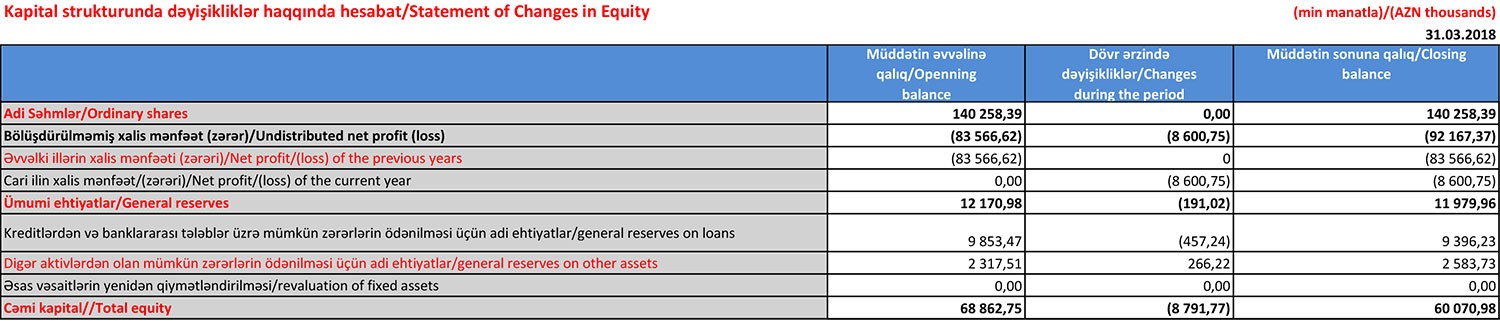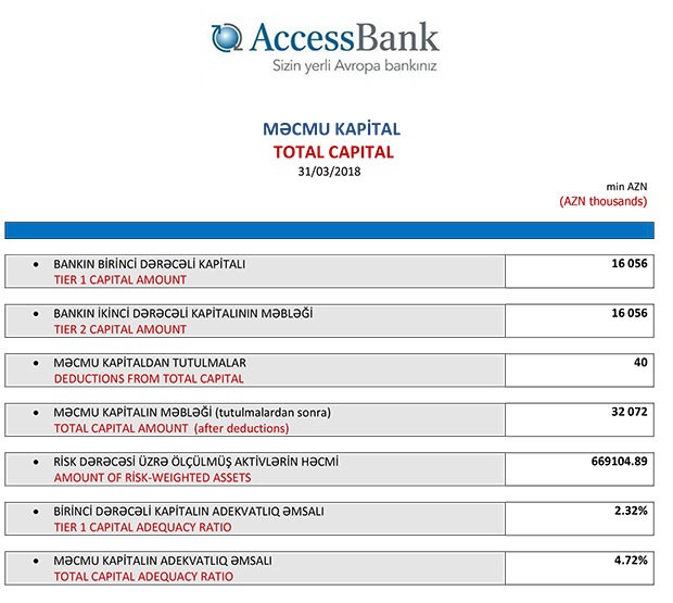 Zərər ilə əlaqədar olaraq “AccesBank”ın məcmu kapitalı 43 milyon 953 min manatdan 32 milyon 72 min manata düşüb. “AccesBank”ın yaxın zamanlarda kapitalının artırılacağı gözlənilir.