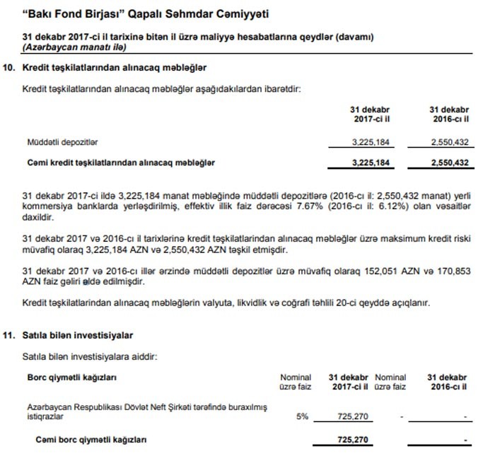 "Marja"nın məlumatına görə, QSC-nin hesabatında bildirilir ki, 31 dekabr 2017-ci ildə müddətli depozitlər 3,225,184 manat təşkil edib (2016-cı il: 2,550,432 manat). Depozitlər 7.67% (2016-cı il: 6.12%) effektiv illik faiz dərəcəsi ilə yerləşdirilib.