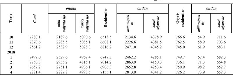 Apreldə manatda əmanətlər 136,7 milyon manat, xarici valyutada əmanətlər isə 87,4 milyon manat artıb. Cəmi əmanətlər isə 224,2 milyon manat artaraq 7 milyard 881.4 milyon manata çatıb.