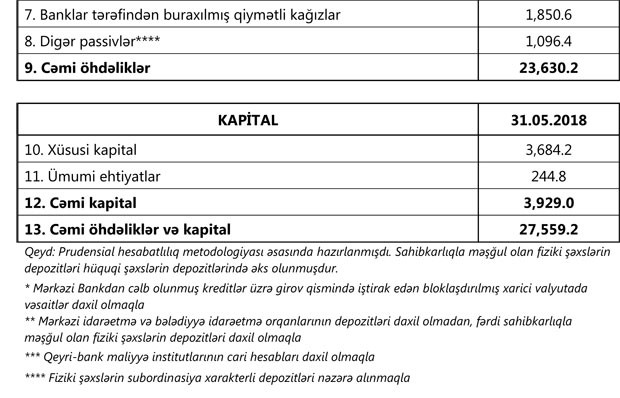 Sektorun balans kapitalı 3 milyard 929 milyon manat, əhalinin əmanətləri isə 7 milyard 868 milyon manat olub. 2018-ci ilin may ayı ərzində bank sektorunun aktivləri 0.3% (92 mln. manat), öhdəlikləri 0.6% (149 mln. manat) azalıb, kapitalı isə 1.5% (57 mln. manat) artıb. Bank sektorunda kredit aktivliyinin artması müşahidə olunur. Belə ki, kredit portfeli may ayı ərzində 1.1% (130 mln. manat) artıb.