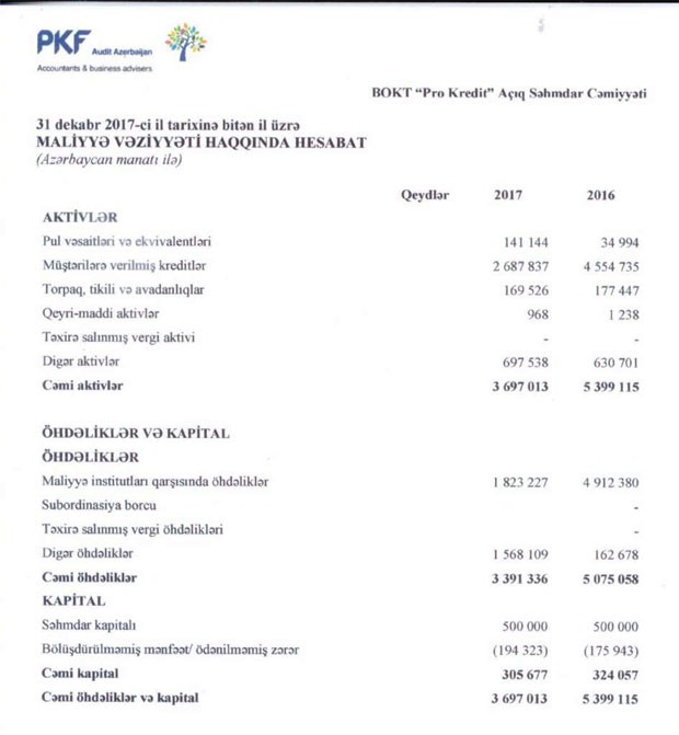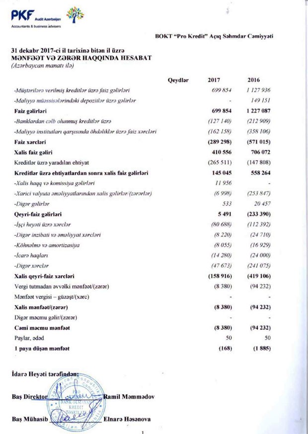 “Pro Kredit BOKT” ASC 2017-ci ili 8 min 380 manat zərər ilə başa vurub. ASC, 2016-cı ili 94 min 232 manat zərər ilə bağlamışdı. Beləliklə, BOKT-ın zərəri 11 dəfədən çox azalıb.