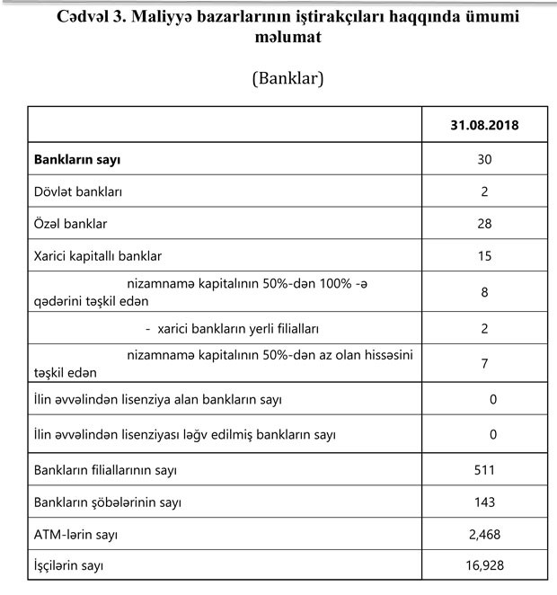 Fəaliyyət göstərən 30 bankın filiallarının sayı 511, şöbələrinin sayı 143, ATM-lərin sayı 2 468 olub. Bütövlükdə, bank sektorunun işçi heyəti avqust ayı ərzində 0.4% (61 nəfər) artaraq 16 936 nəfər təşkil edib. Ümumilikdə isə ilin əvvəlindən sektorda çalışanların sayı 4.7% (765 nəfər) artıb.