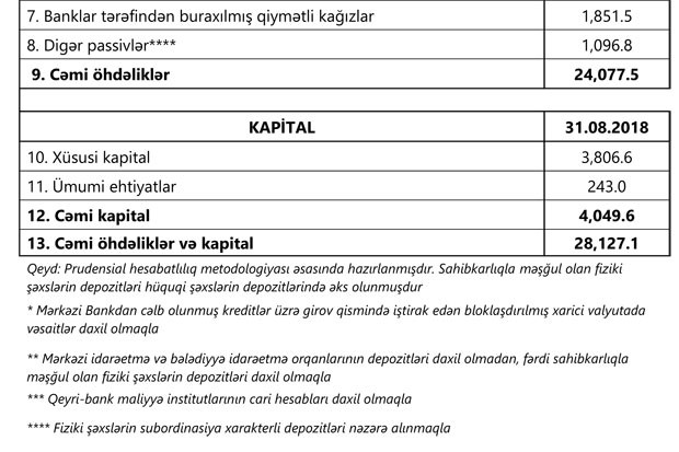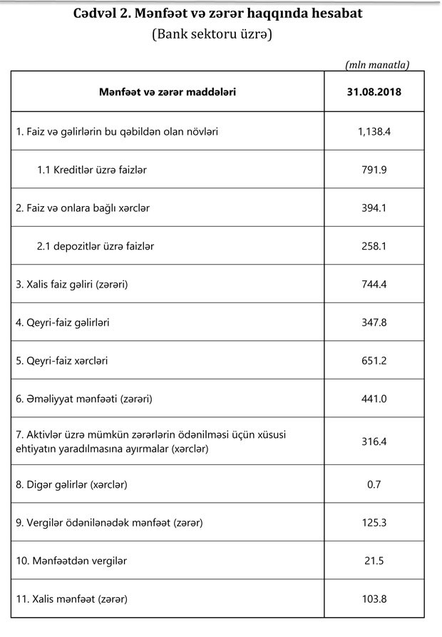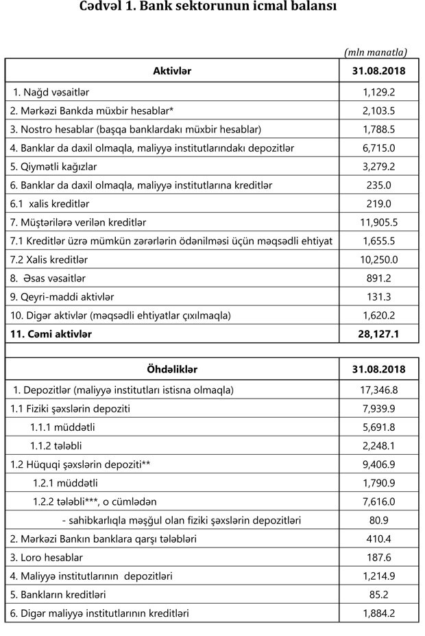2018-ci ilin avqust ayı ərzində bank sektorunun aktivləri 0.7% (196.4 mln. manat), öhdəlikləri 0.3% (79.2 mln. manat), balans kapitalı isə 3% (117.2 mln. manat) artıb. Bank sektorunda kredit aktivliyi davam edir. Avqust ayında bankların kredit portfeli 1.2% (135.9 mln. manat) artıb. Ümumilikdə cari ilin əvvəli ilə müqayisədə kredit portfeli üzrə 5% (567.9 mln. manat) artım olub.