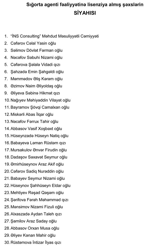 “Sığorta fəaliyyəti haqqında” Azərbaycan Respublikasının Qanununun 86.1-ci maddəsinə və Azərbaycan Respublikasının Maliyyə Bazarlarına Nəzarət Palatasının Nizamnaməsinin 4.10.5-ci yarımbəndinə əsasən Maliyyə Bazarlarına Nəzarət Palatasının İdarə Heyətinin qərarı ilə sıyahıda adları qeyd edilən 1 hüquqi şəxsə və 62 nəfər fiziki şəxsə sığorta agenti fəaliyyətinə müddətsiz lisenziyalar verilib.