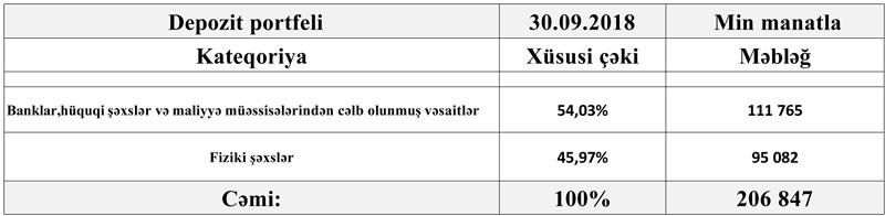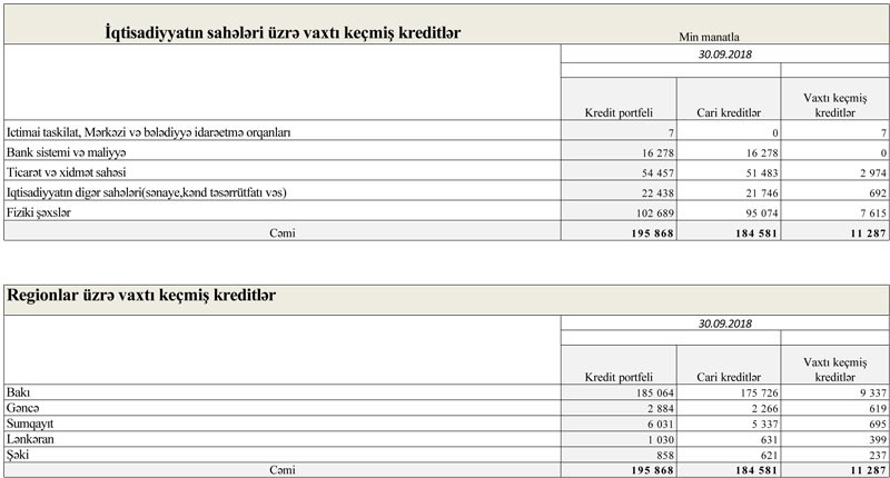 30 Sentyabr 2018-ci il tarixinə olan məlumata görə, Bankın 195 milyon 868 min manatlıq kredit portfelinin 11 milyon 287 min manatının və ya 5,7%-nin ödəmə vaxtı keçib.