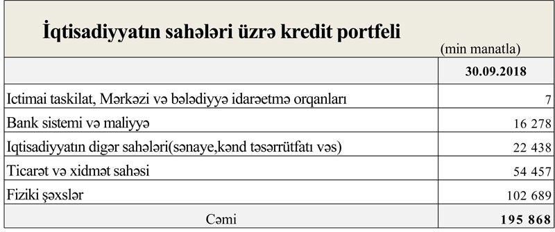 30 Sentyabr 2017-ci il tarixində 127 milyon 934 min manat təşkil etmiş müştərilərə verilmiş kreditlər (məqsədli ehtiyatlar çıxılmaqla) 30 Sentyabr 2018-ci il tarixində 187 milyon 758 min manata çatıb (46,8% artım).