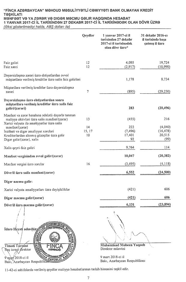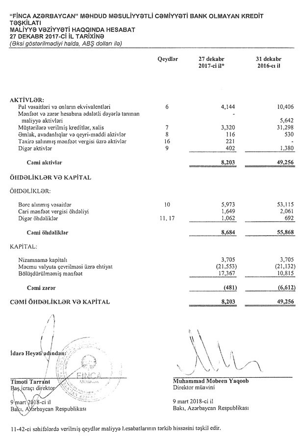 Hesabatda qeyd edilib ki, 31 Dekabr 2017-ci il tarixində “Finca Azərbaycan” 8 milyon 203 min manat, 2016-cı ilin sonunda isə 49 milyon 256 min manat cəmi aktivlərə malik olub.