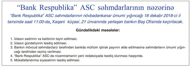 18 Dekabr 2018-ci il tarixində “Bank Respublika” ASC səhmdarlarının növbədənkənar ümumi yığıncağı keçiriləcək.