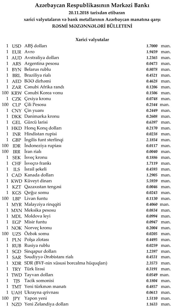 2018-ci ilin Noyabr ayının 20-nə Mərkəzi Bankın açıqladığı rəsmi Dollar/Manat məzənnəsi Noyabrın 19-u ilə müqayisədə dəyişməyərək 1,7000 manat olub, Avro/manat məzənnəsi 1.9459 manata, Rubl/manat məzənnəsi isə 0,0259 manata qalxıb.