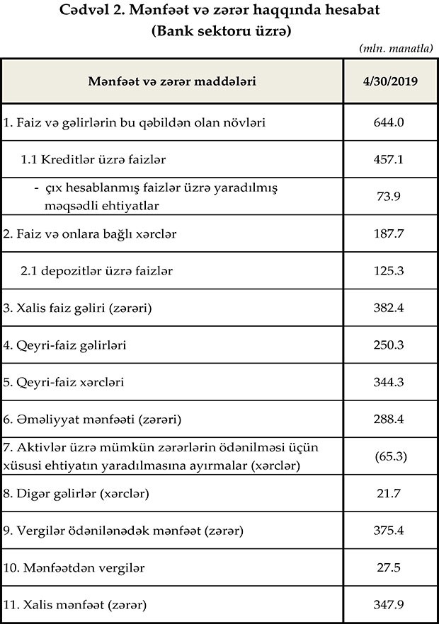Aprel ayında bankların əməliyyat mənfəəti 288.4 mln. manat, xalis mənfəəti isə 347.9 mln. manat təşkil edib. Ötən ilin müvafiq dövrü ilə müqayisədə faiz gəlirləri 14.8%, kreditlər üzrə faiz gəlirləri isə 18.2% artıb.