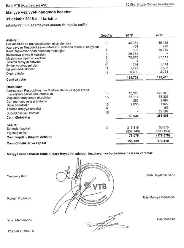 Ötən il Bank VTB (Azərbaycan) kapital defisitini də aradan qaldırıb. 2017-ci ildə 179 milyon 678 min manat kapital defisitinə malik olan Bank, 2018-ci ilin sonunda 78 milyon 75 min manat cəmi kapitala malik olub. Defisit, səhmdar kapitalının 50 milyon 815 min manatdan 315 milyon 815 min manata qaldırılması hesabına aradan qaldırılıb. Bankın yığılmış 237 milyon 740 min manat zərəri silinib.
