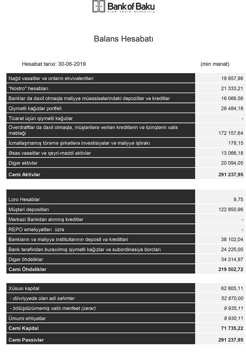 31 Mart 2019-cu il tarixində isə “Bank of Baku” 270 milyon 630 min manat cəmi aktivlərə (o cümlədən 180 milyon 926 min manatı müştərilərə verilən kreditlər), 238 milyon 530 min manat cəmi öhdəliklərə və 32 milyon 100 min manat cəmi balans kapitalına malik idi. Cəmi balans kapitalının artmasının səbəbi əldə edilmiş mənfəət hesabına yığılmış zərərin tamamilə ortadan qalxmasıdır.