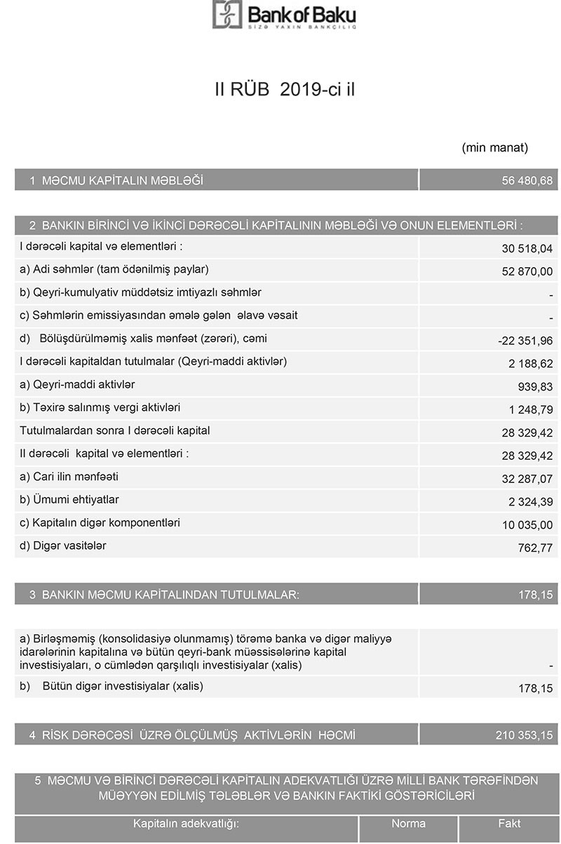 30 İyun 2019-cu il tarixində “Bank of Baku” 56 milyon 480 min manat məcmu kapitala malik olub. Martın sonunda Bankın məcmu kapitalı 18 milyon 705 min manat təşkil etmişdi. Beləliklə, Mayda dollar kreditlərinə kompensasiya ödənildikdən sonra “Bank of Baku”nun məcmu kapitalı minimal tələbi (50 milyon manat) üstələyib.