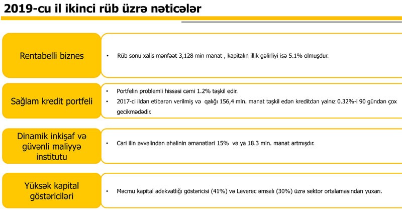 “Marja” Bankın rüblük hesabatına istinadən xəbər verir ki, 2019-cu ilin yanvar-iyun dövründə ötən ilin eyni dövrü ilə müqayisədə "Expressbank"ın faiz gəlirləri 25,4% artaraq 18 milyon 731 min manat, qeyri-faiz gəlirləri isə 29,7% artaraq 7 milyon 36 min manat təşkil edib.