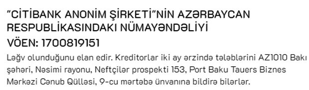 "Citibank Anonim Şirkəti"nin Azərbaycan Respublikasındakı nümayəndəliyi ləğv olunduğunu elan edib.