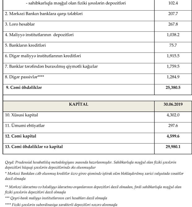 30 iyun 2019-cu il tarixinə Azərbaycanda fəaliyyət göstərən bankların cəmi aktivləri 29 milyard 980.1 milyon manat, cəmi öhdəlikləri isə 25 milyard 380.5 milyon manat təşkil edib. Sektorun balans kapitalı 4 milyard 599.6 milyon manat olub.