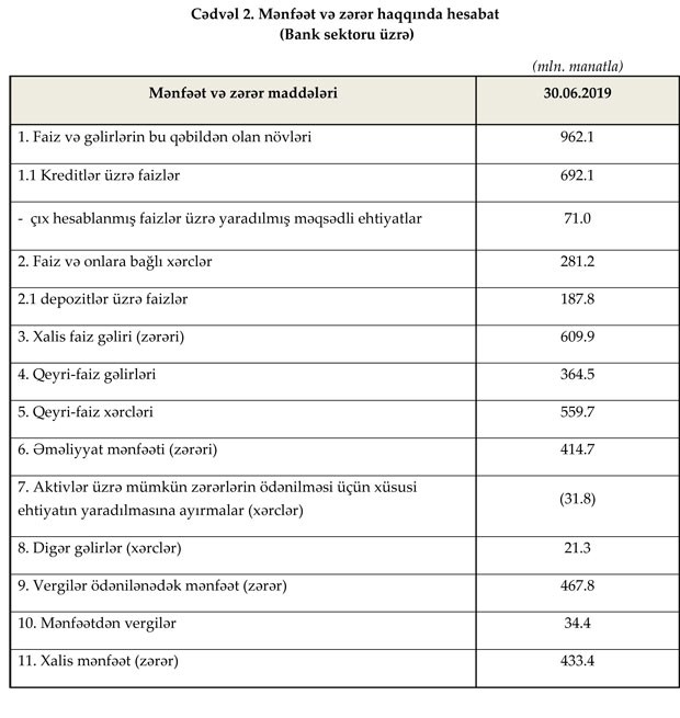 Cari ilin ilk yarımilliyində banklar 433.4 milyon manat xalis mənfəət əldə ediblər. Ötən ilin müvafiq dövrü ilə müqayisədə faiz gəlirləri 14.1% (118.8 milyon manat), kreditlər üzrə faiz gəlirləri isə 18.4% (107.8 milyon manat) artıb.