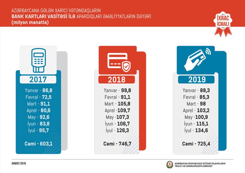 Bu ilin iyul ayında ölkəmizə gələn xarici vətəndaşların sayının 10,6 faiz artmasına paralel olaraq onların bank kartları vasitəsi ilə xərcləmələrində də artım müşahidə edilib. Belə ki, 2019-cu ilin iyul ayında ölkəmizə gələn xarici vətəndaşların bank kartları vasitəsi ilə apardıqları əməliyyatları 134,6 milyon manat təşkil edib və ötən ilin iyul ayı ilə müqayisədə 7 faiz artıb.