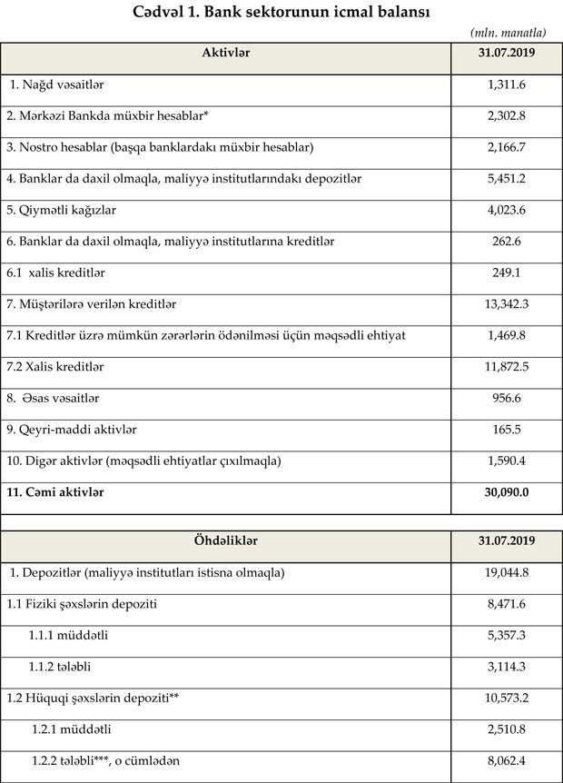 Maliyyə Bazarlarına Nəzarət Palatasının açıqladığı məlumata görə, 31 iyul 2019-cu il tarixinə Azərbaycanda fəaliyyət göstərən bankların cəmi aktivləri 30 milyard 90 milyon manat, cəmi öhdəlikləri isə 25 milyard 507 milyon manat təşkil edib. Sektorun balans kapitalı 4 milyard 583 milyon manat olub.