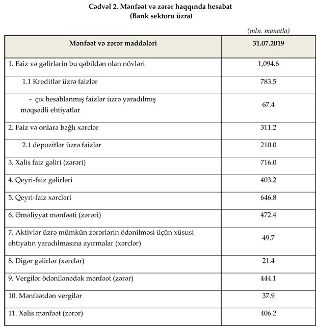 İyul ayında bankların əməliyyat mənfəəti 13.9% (57.7 milyon manat) artaraq 472.4 milyon manat, xalis mənfəəti isə 406.2 milyon manat təşkil edib. Ötən ilin müvafiq dövrü ilə müqayisədə faiz gəlirləri 10.7%, kreditlər üzrə faiz gəlirləri isə 14.2% artmışdır.