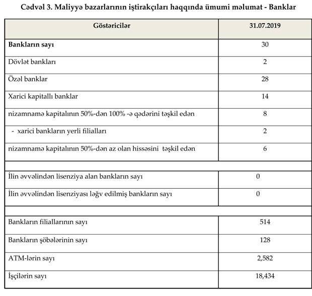 Fəaliyyət göstərən 30 bankın filiallarının sayı 514, şöbələrinin sayı 128, ATM-lərin sayı 2582 olub. Bank sektorunun işçi heyətinin sayında artım iyul ayında da davam etmişdir. Belə ki, 2019-cu ilin iyul ayında işçi sayı 0.8% (146 nəfər) artaraq 18 min434 nəfər təşkil edib.