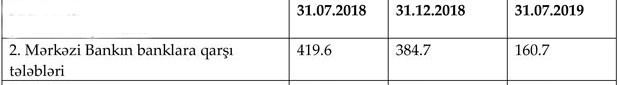 2018-ci ilin İyul ayının sonu ilə müqayisədə Mərkəzi Bankın banklara qarşı tələbləri 258,9 milyon manat azalıb.