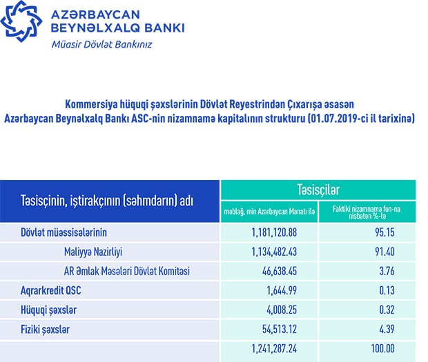 22.07.2019-cu il tarixinə olan məlumata görə, “Azərbaycan Beynəlxalq Bankı” ASC-nin nizamanmə kapitalının 91.40%-i Maliyyə Nazirliyinə, 3.76%-i Əmlak Məsələləri Dövlət Komitəsinə, 0.13 %-i "Aqrarkredit" QSC-yə, 0.32%-i hüquqi şəxslərə və 4.39%-i fiziki şəxslərə məxsusdur.