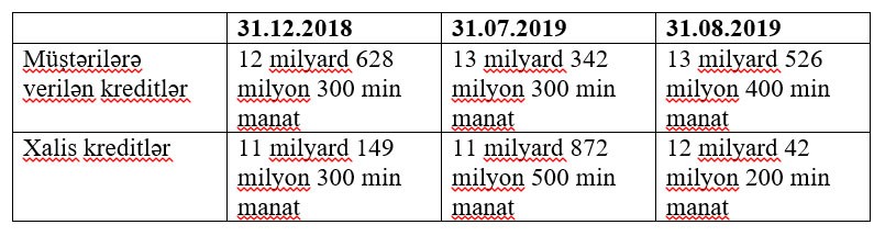 2018-ci ilin sonu ilə müqayisədə 8 ay ərzində müştərilərə verilən kreditlər 898 milyon 100 min manat, xalis kreditlər isə 892 milyon 900 min manat artıb.