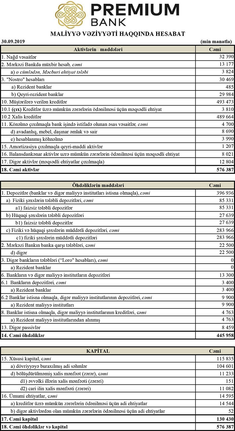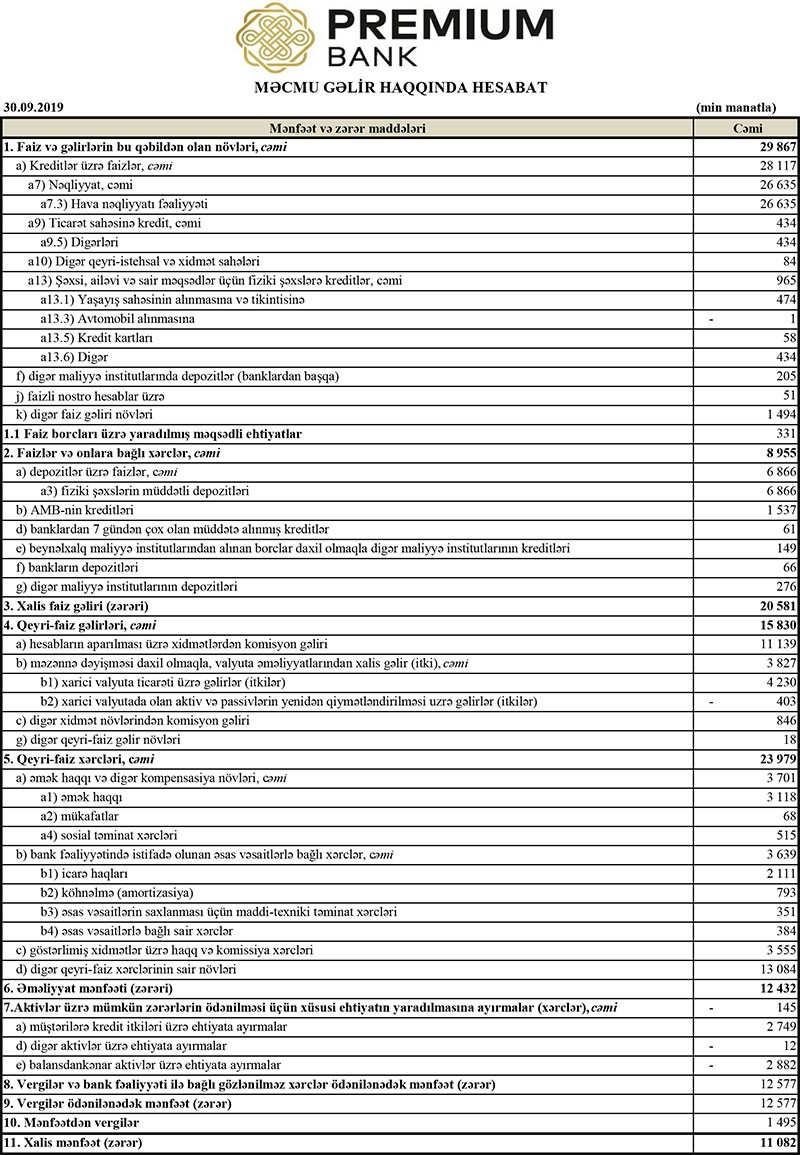 Müqayisə üçün qeyd edək ki, 2018-ci ilin yanvar-sentyabr dövründə “Premium Bank”ın cəmi gəlirlər 42 milyon 973 min manat, cəmi xərcləri 33 milyon 557 min manat, əməliyyat mənfəəti 9 milyon 416 min manat təşkil etmişdi. Eyni zamanda, aktivlər üzrə mümkün zərərlərin ödənilməsi üçün yaradılmış xüsusi ehtiyatdan 19 milyon 168 min manat azad olmuş və mənfəət 28 milyon 585 min manata yüksəlmişdi. Bank 404 min manat mənfəət vergisi ödəmiş və həmin dövrü 28 milyon 180 min manat xalis mənfəət ilə bağlamışdı.