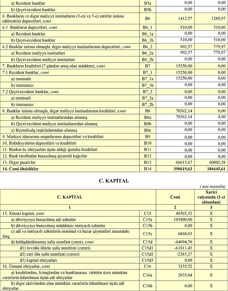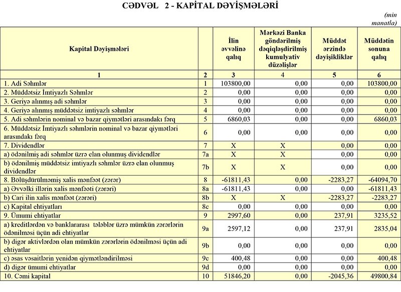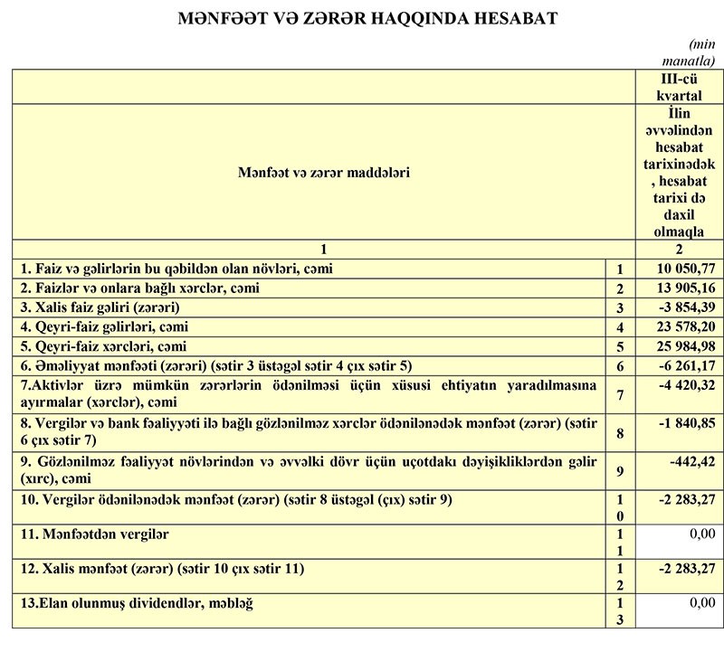 Ötən ilin 9 ayında “AGBank”ın cəmi gəlirləri 37 milyon 163 min manat, cəmi xərcləri 40 milyon 322 min manat, əməliyyat zərəri 3 milyon 159 min manat, xalis zərəri isə 6 milyon 122 min manat təşkil etmişdi.