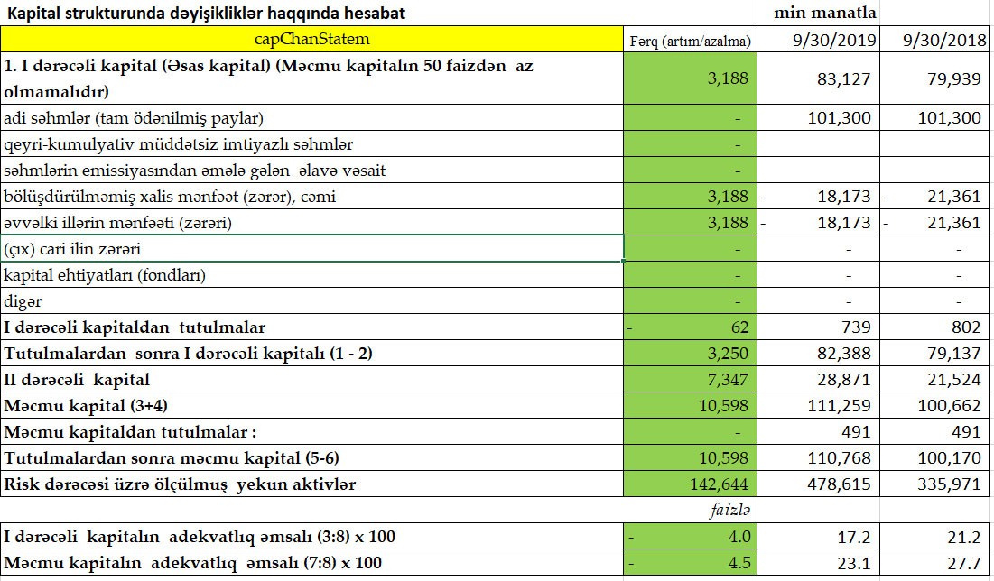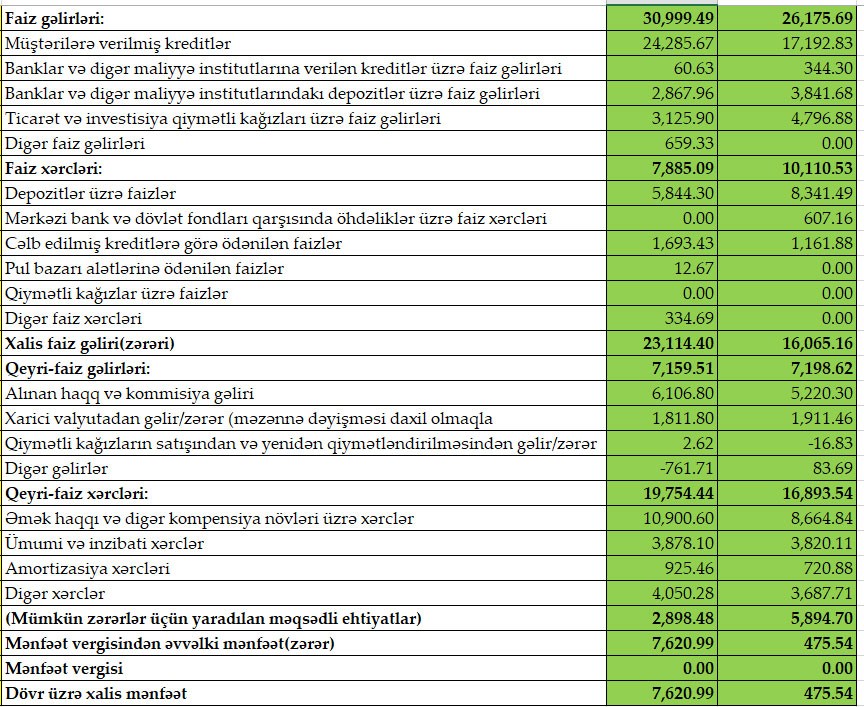 Ötən ilin 9 ayında 26 milyon 175 min manat təşkil etmiş faiz gəlirləri bu ilin 9 ayında 30 milyon 999 min manat, keçən ilin yanvar-sentyabr dövründə 7 milyon 198 min manat təşkil etmiş qeyri-faiz gəlirləri cari ilin eyni dövründə 7 milyon 159 min manat təşkil edib.
