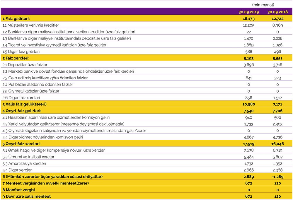 Müqayisə üçün qeyd edək ki, 2018-ci ilin yanvar-sentyabr dövründə “AzərTürk Bank”ın cəmi gəlirləri 20 milyon 428 min manat, cəmi xərcləri 21 milyon 597 min manat və nəticədə 1 milyon 169 min manat əməliyyat zərəri yaranmışdı. Mümkün zərərlər üçün yaradılmış xüsusi ehtiyatdan 1 milyon 289 min manatın azad olması hesabına Bank əməliyyat zərərini bağlamış və 120 min manta xalis mənfəət təmin etmişdi.