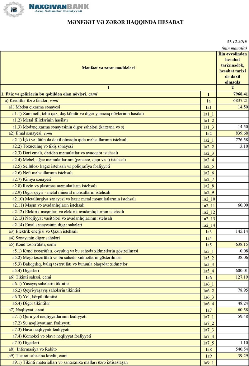 Qeyd edək ki, 2018-ci ildə “Naxçıvanbank”ın cəmi faiz və qeyri-faiz gəlirləri 10 milyon 983 min manat, o cümlədən faiz gəlirləri 6 milyon 960 min manat, qeyri-faiz gəlirləri isə 4 milyon 23 min manat təşkil edib.