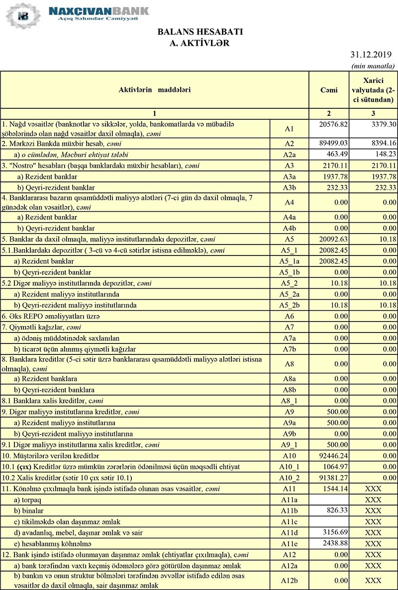 2019-cu ilin sonunda “Naxçıvanbank” 232 milyon 21 min manat cəmi aktivlərə malik olub. Aktivlərin 92 milyon 446 min manatını müştərilərə verilən kreditlər təşkil edib. Müqayisə üçün qeyd edək ki, 31 Dekabr 2018-ci il tarixində “Naxçıvanbank” 196 milyon 541 min manat cəmi aktivlərə malik idi. Aktivlərin 64 milyon 854 min manatını müştərilərə verilən kreditlər təşkil etmişdi.