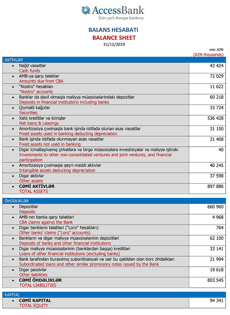 31 Dekabr 2019-cu il tarixində “AccessBank” 897 milyon 886 min manat cəmi aktivlərə malik olub və aktivlərin 536 milyon 428 min manatını xalis kreditlər və lizinqlər təşkil edib.