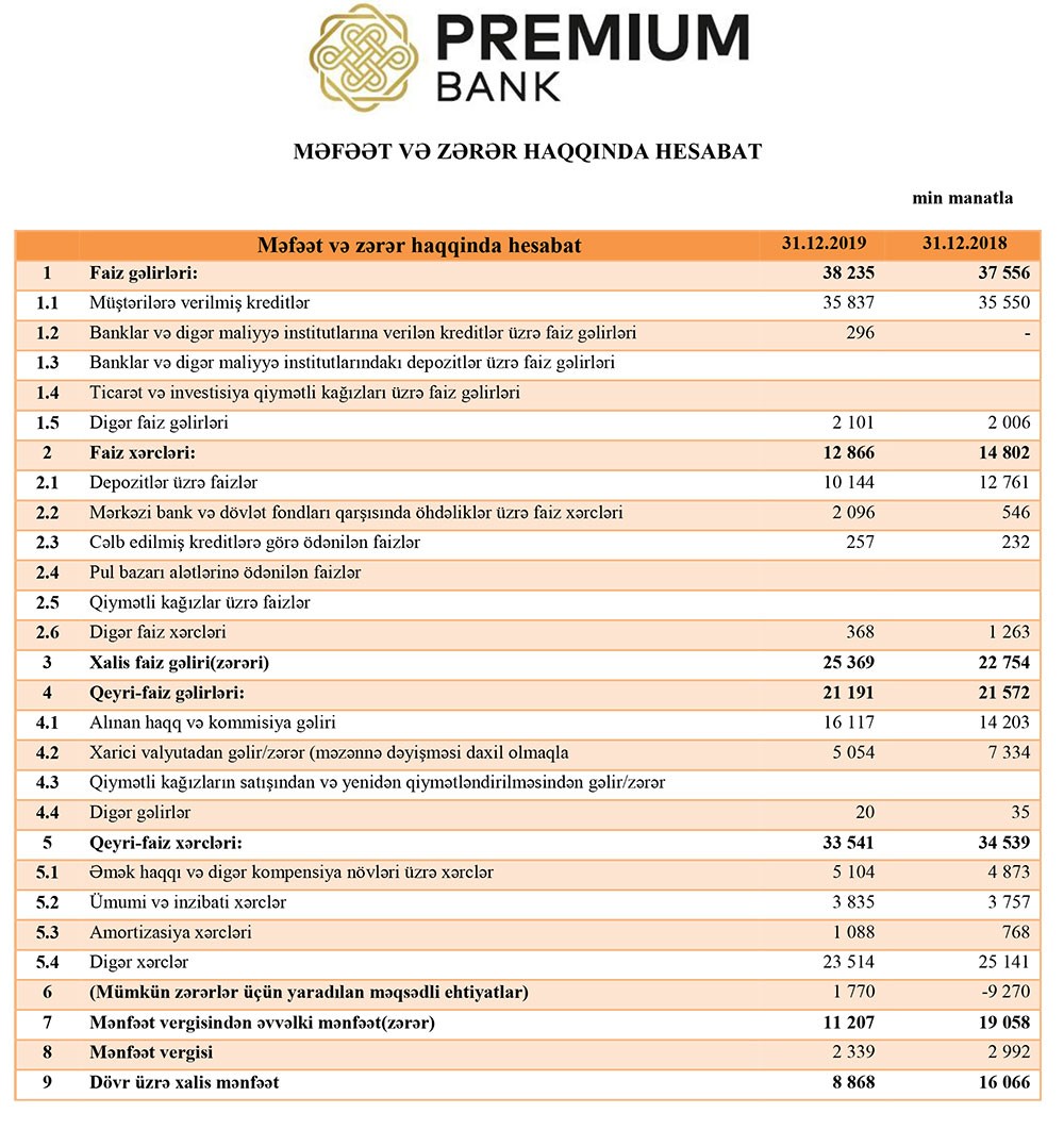 Müqayisə üçün qeyd edək ki, 2018-ci ildə “Premiumbank”ın cəmi faiz və qeyri-faiz gəlirləri 59 milyon 128 min manat, faiz və qeyri-faiz xərcləri 49 milyon 341 min manat, əməliyyat mənfəəti 9 milyon 787 min manat təşkil etmişdi. Həmçinin, mümkün zərərlər üçün yaradılan məqsədli ehtiyatdan azad olan 9 milyon 270 min manat əməliyyat mənfəətinə əlavə edilmiş və Bankın mənfəəti 19 milyon 58 min manata yüksəlmişdi. 2018-ci ildə “Premiumbank” 2 milyon 992 min manat mənfəət vergisi ödədiyindən həmin ili 16 milyon 66 min manat xalis mənfəət ilə bağlamışdı.