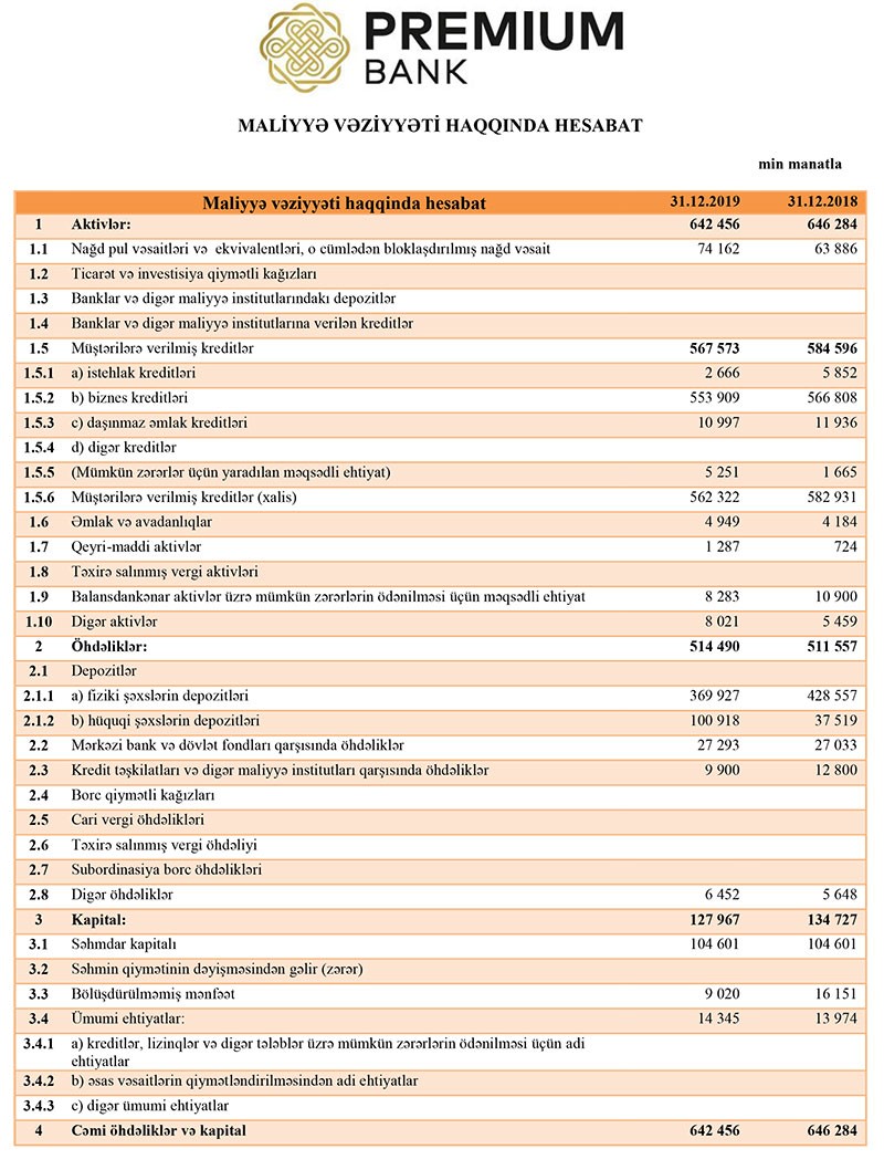 2018-ci ilin sonunda “Premiumbank”ın cəmi aktivləri 646 milyon 284 min manat ikən, 2019-cu ildə 642 milyon 456 min manatadək düşüb. Bankın müştərilərə verdiyi kreditlər isə 17 milyon 23 min manat azalaraq 567 milyon 573 min manata geriləyib.