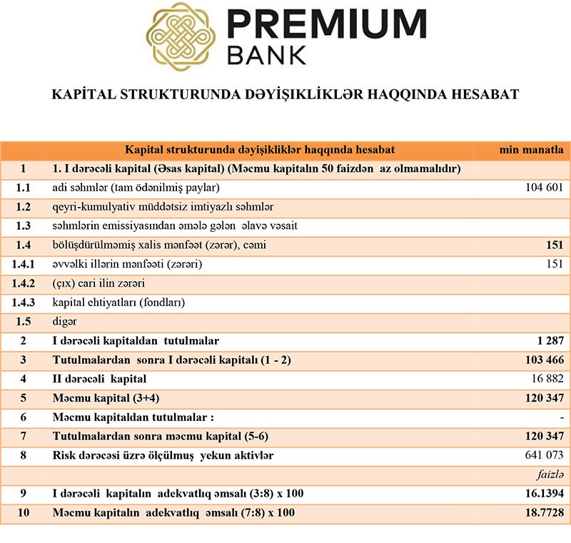 31 Dekabr 2019-cu il tarixində "Premiumbank" 120 milyon 347 min manat məcmu kapitala malik olub.