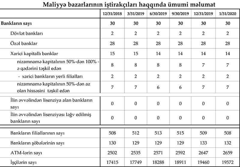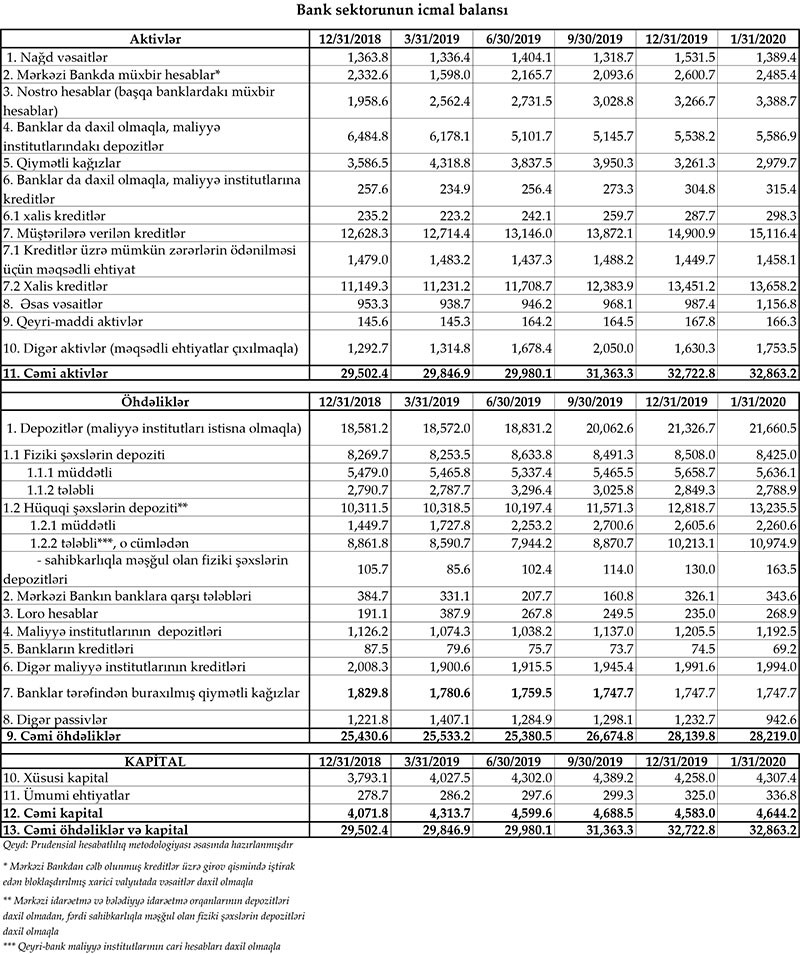 Azərbaycan Mərkəzi Bankı 31 yanvar 2020-ci il tarixinə olan bank sektorunun əsas göstəriciləri açıqlayıb.