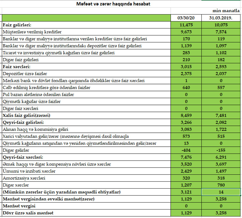 Müqayisə üçün qeyd edək ki, 2019-cu ilin 1-cü rübündə Rabitəbankın cəmi əməliyyat gəlirləri 12 milyon 157 min manat, cəmi əməliyyat xərcləri 8 milyon 884 min manat, əməliyyat mənfəəti 3 milyon 273 min manat təşkil etmişdi. Bank mümkün zərərlər üçün yaradılan məqsədli ehtiyatlara cəmi 14 min manat ayırdığından xalis mənfəəti 3 milyon 258 min manat olmuşdu.