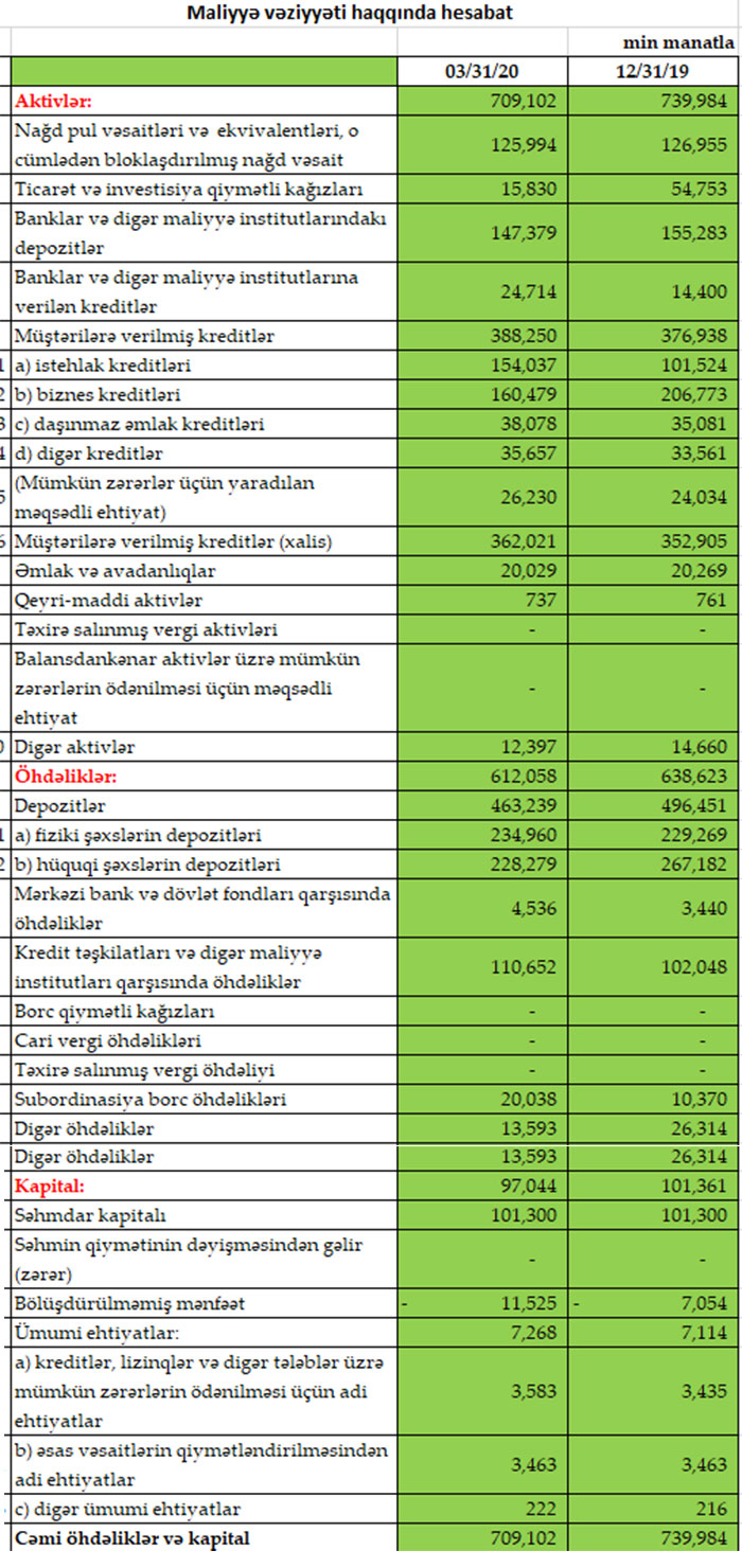 Marja Bankın maliyyə göstəricilərinə istinadən xəbər verir ki, 2020-ci ilin yanvar-mart dövründə Rabitəbankın cəmi əməliyyat gəlirləri 14 milyon 741 min manat, cəmi əməliyyat xərcləri isə 10 milyon 491 min manat təşkil edib. Gəlirlər xərcləri üstələdiyindən Bankın 4 milyon 250 min manat əməliyyat mənfəəti yaranıb. Bank əməliyyat mənfəətinin 3 milyon 120 min manatını mümkün zərərlər üçün yaradılan məqsədli ehtiyatlara ayırdığından ilk rübü 1 milyon 129 min manat xalis mənfəət ilə bağlayıb.