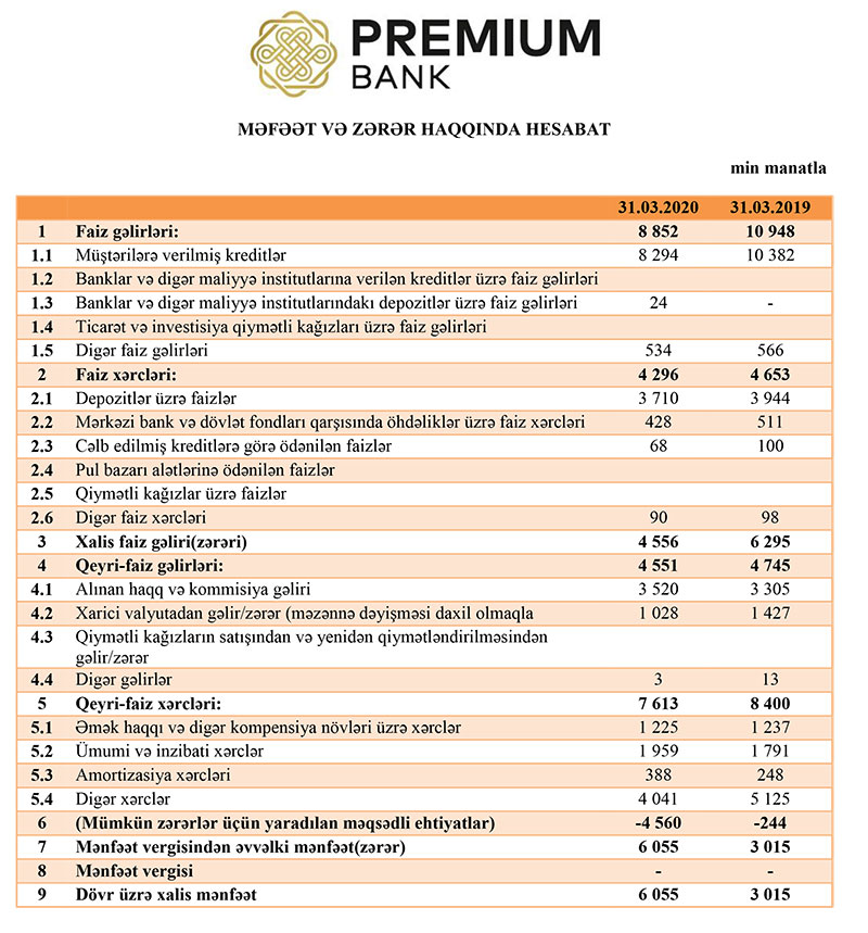 Premiumbank 2020-ci ilin 1-ci rübünü 6 milyon 55 min manat xalis mənfəət ilə başa vurub. Bu, ötən ilin eyni dövrü ilə müqayisədə 2 dəfə çoxdur Bank 2019-cu ilin 1-ci rübnü 3 milyon 15 min manat xalis mənfəət ilə bağlamışdı. İlk rübdəki xalis mənfəətin böyük hissəsi məqsədli ehtiyatlardan qayıtmadan qaynaqlanır.