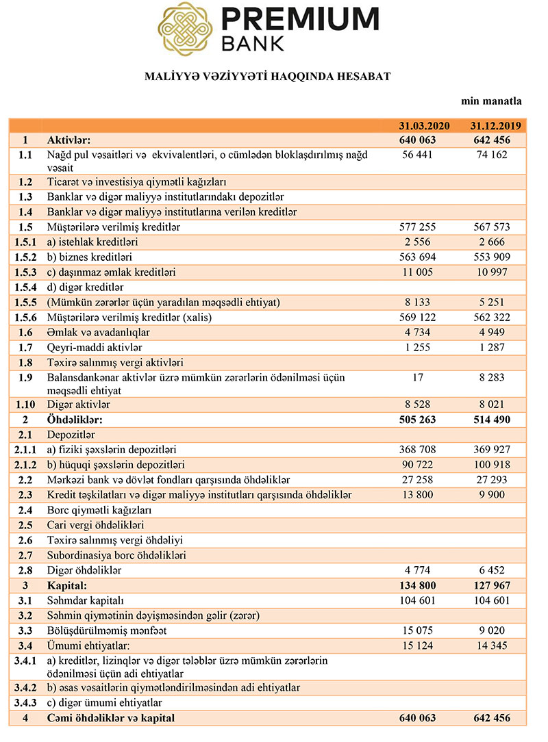 2019-cu ilin sonu ilə müqayisədə Premiumbankın cəmi aktivləri cüzi azalaraq 640 milyon 63 min manata düşüb. Bankın müştərilərə verdiyi kreditlər isə 9 milyon 682 min manat və ya 1,7% artaraq 577 milyon 255 min manata yüksəlib.