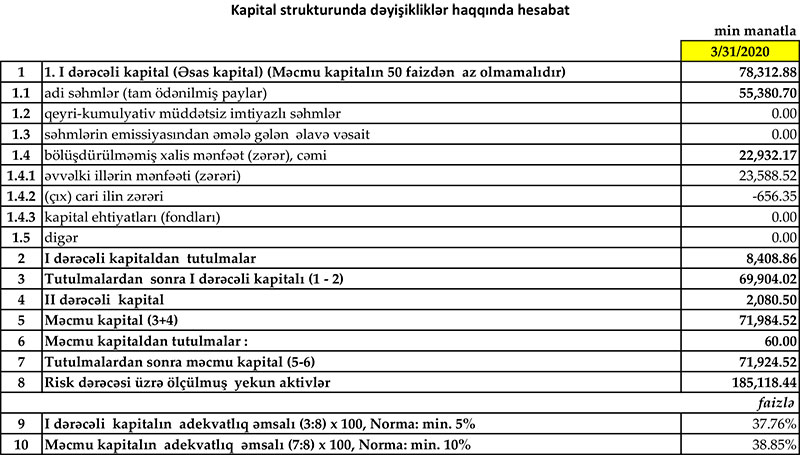 31 Mart 2020-ci il tarixində Yapı Kredi Bank Azərbaycan 71 milyon 924 min manat məcmu kapitala malik olub.