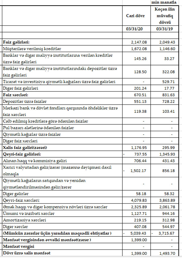 31 Mart 2020-ci il tarixində Bank 255 milyon 411 min manat yığılmış zərərə malik olub.