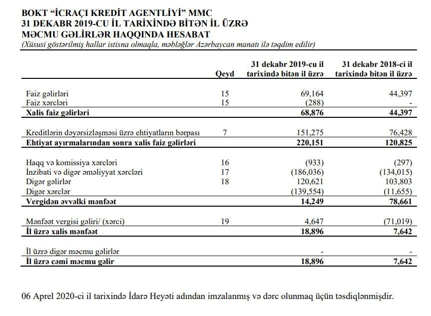 Marja hesabata istinadən xəbər verir ki, “İcraçı Kredit Agentliyi” 2019-cu ili 18 min 896 manat xalis mənfəət ilə başa vurub. Bu, 2018-ci illə müqayisədə 2,5 dəfə çoxdur. 2018-ci illə müqayisədə təşkilatın faiz gəlirləri 56% artaraq 6 9min 164 manata yüksəlib.