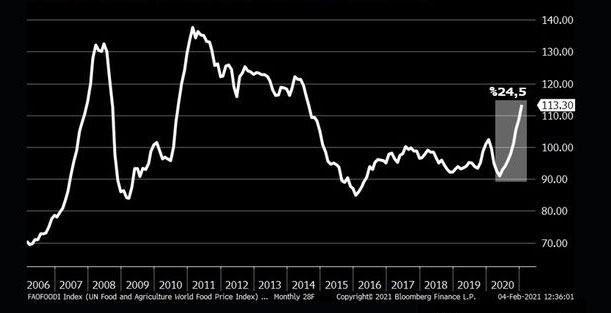 Marja xəbər verir ki, dekabr ayında 107,5% səviyyəsində açıqlanmış İndeks 108,6-ya dəyişdirilib, Yanvar ayında isə 4,33% artaraq 113,3 səviyyəsinə yüksəlib. Beləliklə, qlobal ərzaq qiymətləri 2014-cü ilin İyul ayından bu yana ən yüksək səviyyəni görüb.