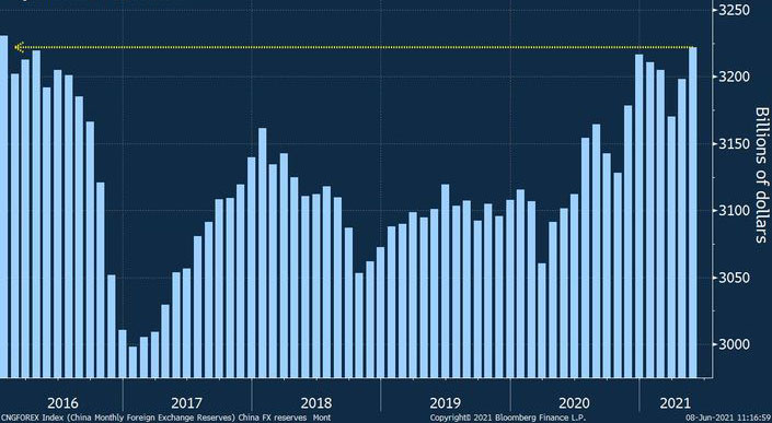 Çinin valyuta ehtiyatları, dolların zəifləməsi və yuana artan tələb ilə əlaqədar olaraq May ayında 3,22 trilyon dollara yüksələrək 2016-cı ilin Yanvar ayından bu yana ən yüksək səviyyəyə çatıb.