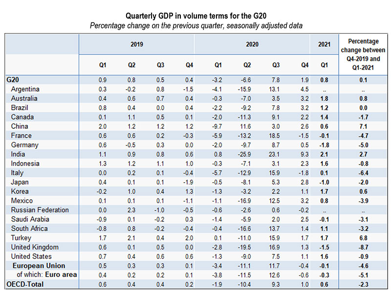 Hindistan, Türkiyə və Çin ÜDM səviyyələrini pandemiyadan əvvəlki dövrə qaytara bilən ilk ölkələr sırasındadır. Artıq 2021-ci ilin birinci rübündə bu nəticəni əldə edən üçlükdə ÜDM artımı müvafiq olaraq 2,1%, 1,7% və 0,6% təşkil edib. Əlavə olaraq, Avstraliya (1,8%), Cənubi Koreya (1,7%) və Braziliya (1,2%) da birinci rübdə pandemiyadan əvvəlki inkişaf səviyyəsinə qayıdıblar.